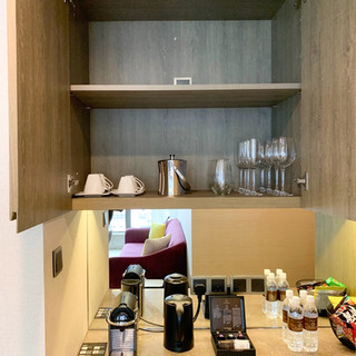 入門的走廊旁,有衣櫃及鞋櫃。櫥櫃中有迷你雪櫃,內有免費飲品。 Nespresso咖啡機、免費茶包及咖啡膠囊、 貼心迎賓小食籃內有薯片及餅乾條。櫃內亦有一系列餐具及杯碟,無論是在酒店內渡週末,還是作為服務式住宅長住,都令客人方便舒適。